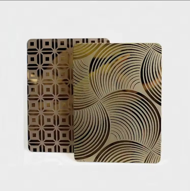 Etched finish is created by a screen printing the protective acid resistant to a polished surface and acid etching the unprotected areas.The etching removes a thin layer of stainless steel and roughens the surface.And etched stainless steel sheet is a type of decorative stainless steel that has undergone a chemical or mechanical process to create patterns, designs, or textures on its surface.The etching process selectively removes material from specific areas, resulting in a contrast between the etched and unetched regions.This creates intricate and precise designs that are both aesthetically pleasing and durable.